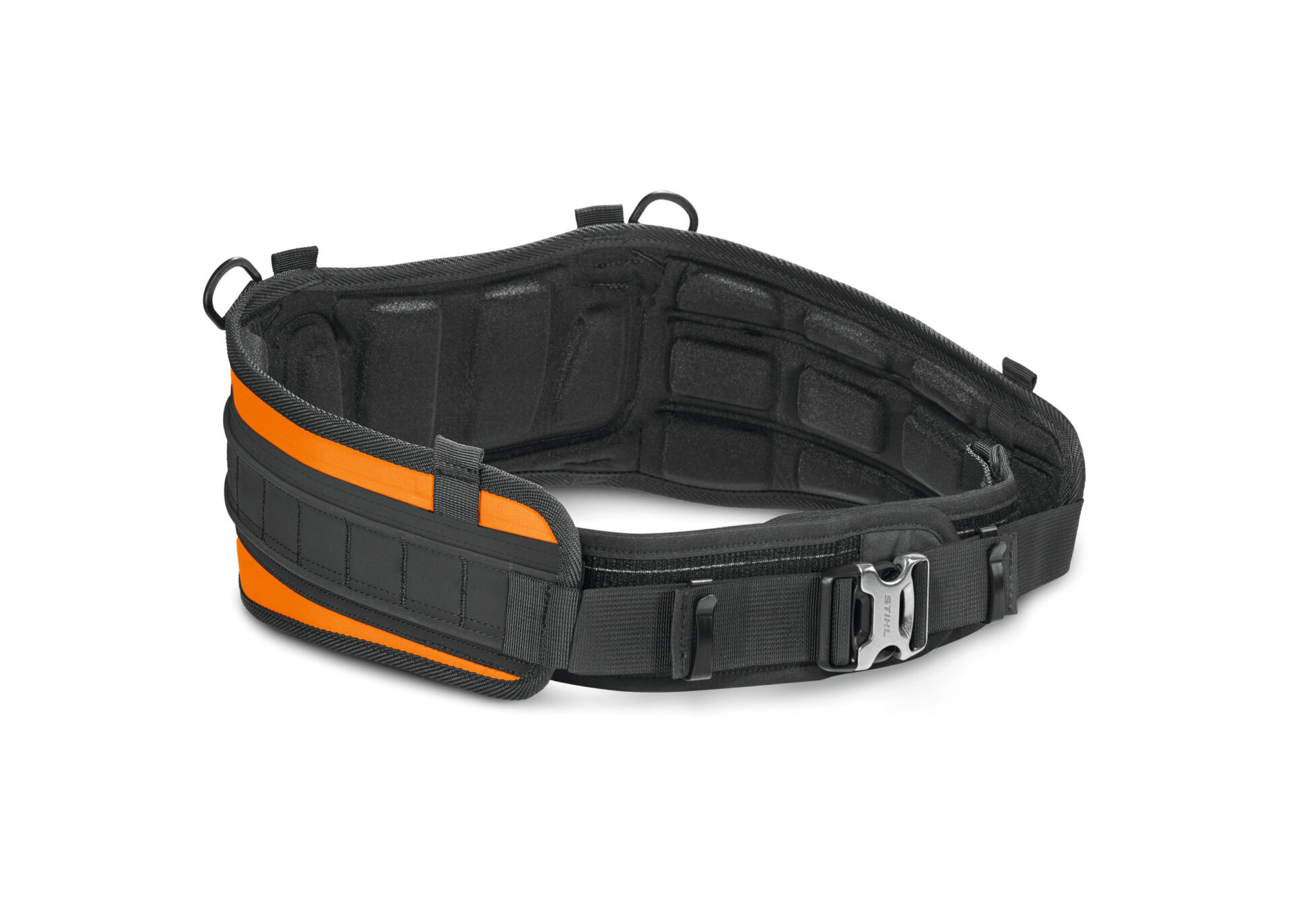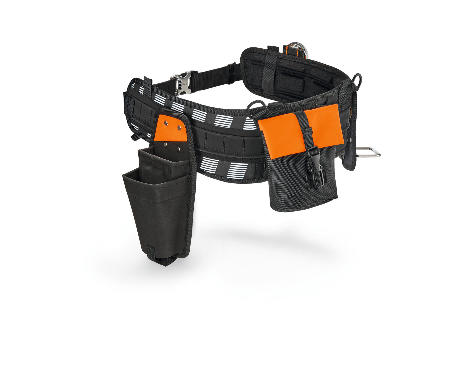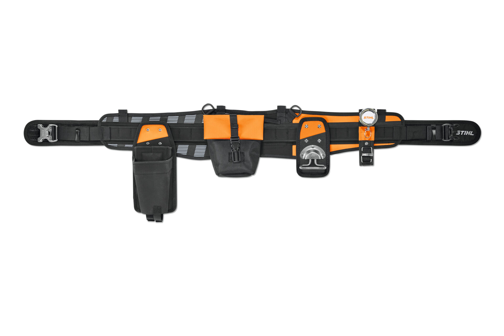 Brašny a držáky se jednoduše připevňují k upevňovací liště pomocí robustních upevňovacích spon STIHL ze systému klipů vyvinutého společností STIHL. Díky tomu máte vše rychle a snadno na dosah a hmotnost je rovnoměrně rozložena na boky. Spona pro zapínání bederního pásu STIHL ADVANCE X-Flex se skládá z odolného hliníkového pouzdra. Střední část robustního bederního pásu STIHL ADVANCE X-Flex má vysoký podíl oranžové barvy a reflexní pruhy pro dobrou viditelnost.