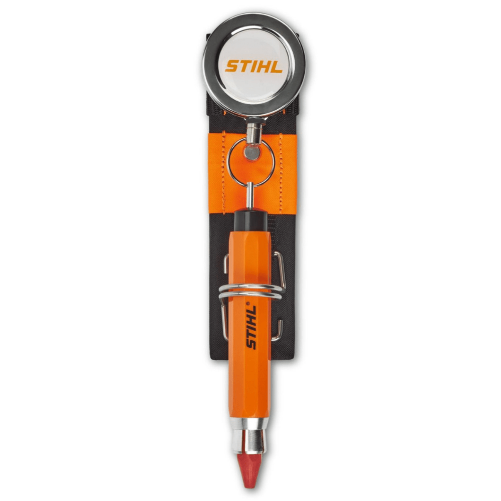 Držák křídy STIHL ADVANCE X-Flex je součástí modulárního systému STIHL ADVANCE X-Flex. Pokud jako lesní profesionál potřebujete křídu pro značení, je dobré ji mít neustále po ruce. Zároveň by však mělo být možné ji bezpečně uložit při provádění jakýchkoli jiných činností. Právě k tomu slouží držák křídy STIHL ADVANCE X-Flex. Na jedné straně umožňuje obzvláště velký pracovní záběr při značení pomocí přiloženého navijáku s dlouhým kovovým kabelem, například pomocí značkovací křídy STIHL Marker Pro. A na druhé straně kovová lišta vždy spolehlivě udrží křídu v držáku při přepravě.