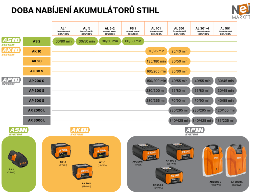 Zádový akumulátor STIHL AR 2000 L je kompatibilní s rychlonabíječkami akumulátorů STIHL AL. K nabíjení akumulátoru AR 2000 L potřebujete připojovací kabel pro akumulátory AR L a adaptér pro akumulátor STIHL AP. Indikátor stavu nabití se 6 LED diodami vám ukazuje aktuální stav nabití akumulátoru STIHL AR 2000 L.