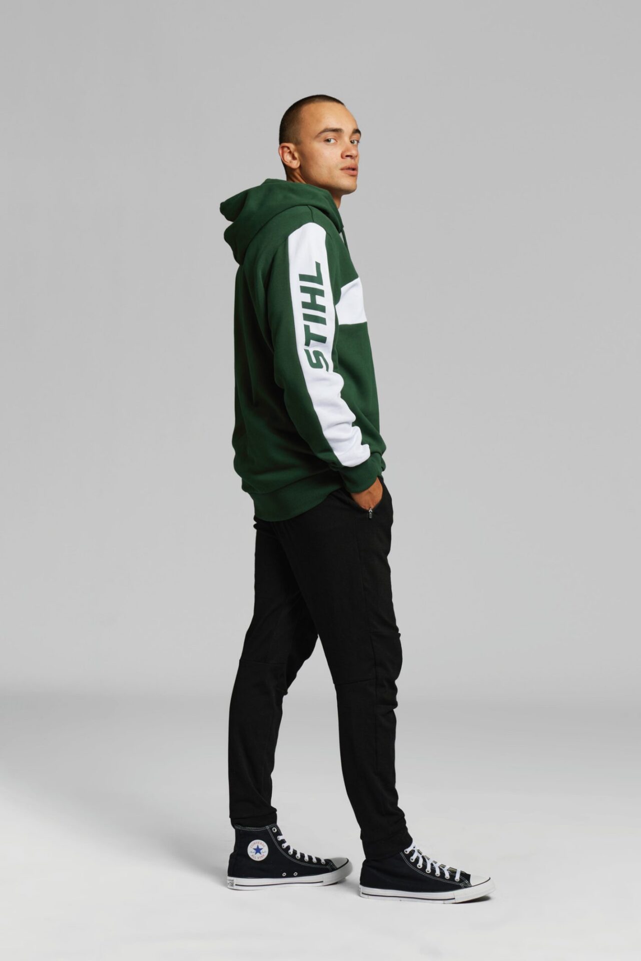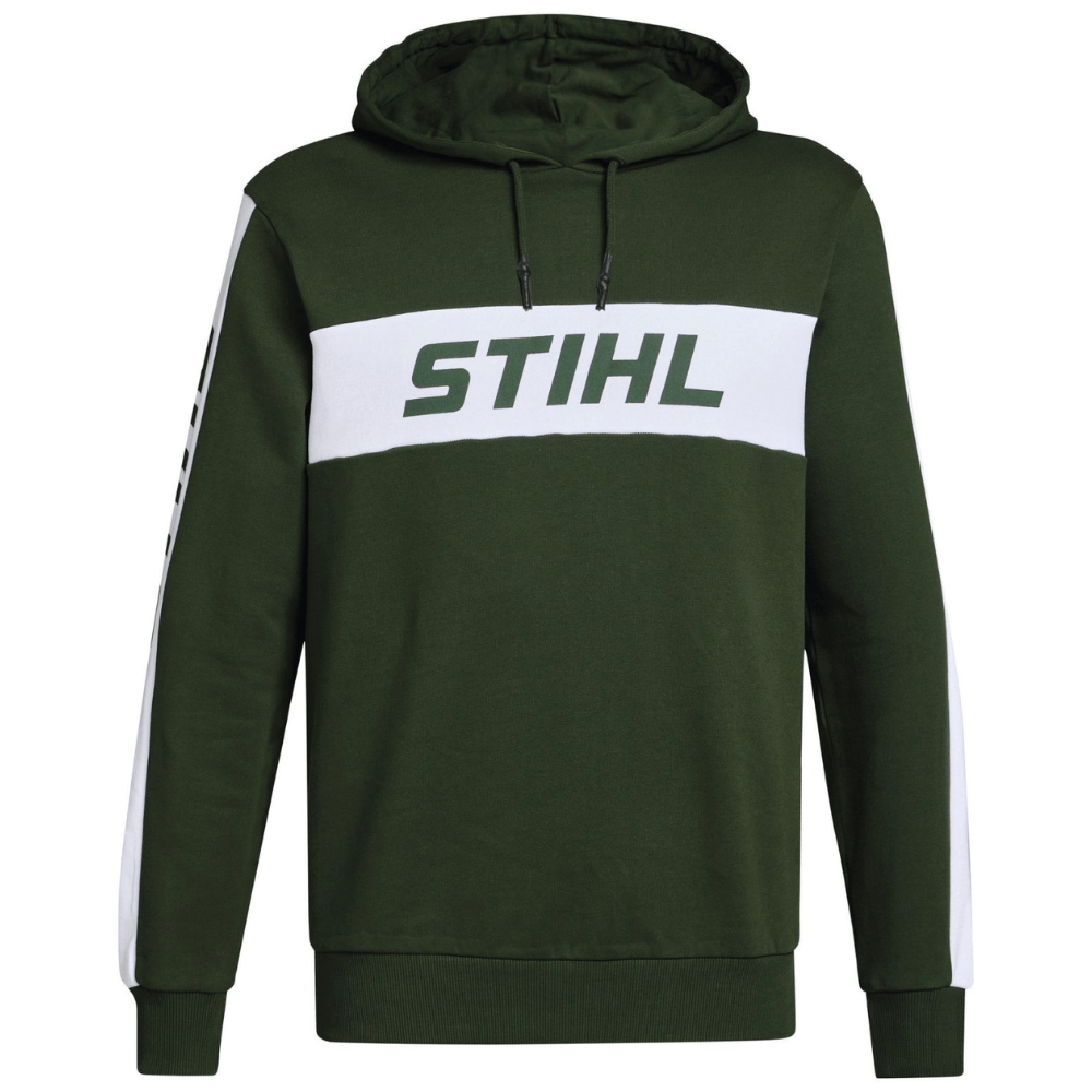 Zeleno-bílá barevná mikina s kapucí pro muže i ženy. Na hrudi a na pažích je velké zelené logo STIHL. Mikina je vyrobena ze 100% bavlny a z vnitřní strany je počesaná, aby se pohodlně nosila.