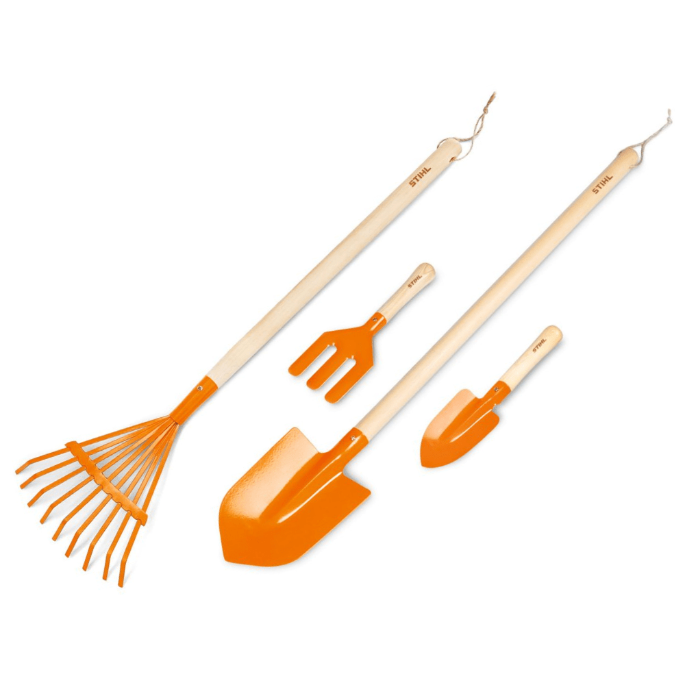 Pro budoucí zahradníky: s touto sadou vysoce kvalitního zahradního nářadí pro děti STIHL mohou malí zahradníci pracovat společně s dospělými. Sada obsahuje velkou lopatu a hrábě na listí spolu s menší lopatkou a hráběmi. Všechny produkty jsou vyrobeny z borovicového dřeva s certifikátem FSC, lakované a potažené kovem. Dřevěné násady zdobí potisk s logem STIHL.