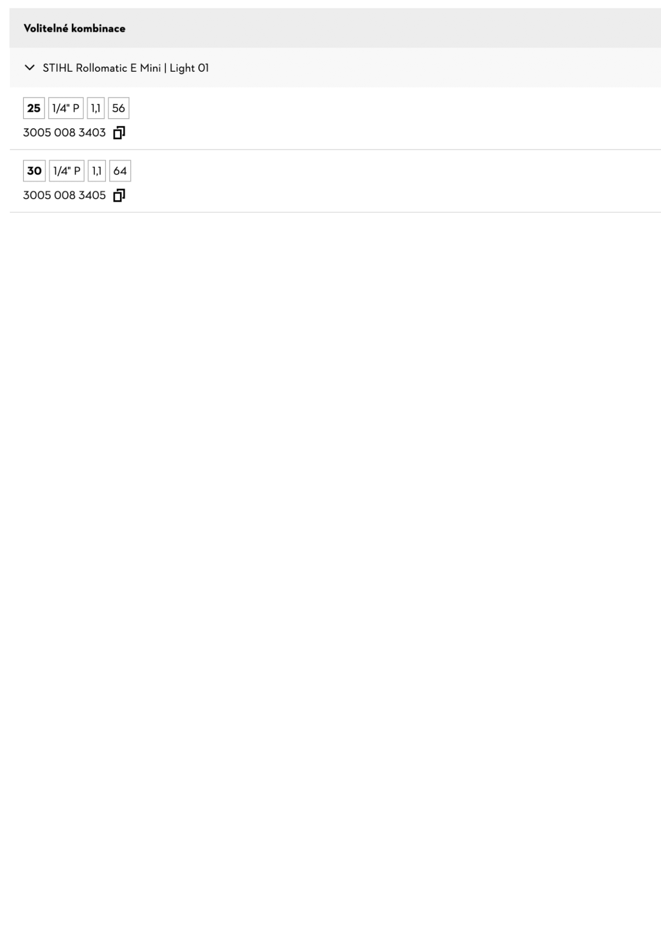 Seznam kompatibilních vodících lišt a parametrů pro výběr řetězu