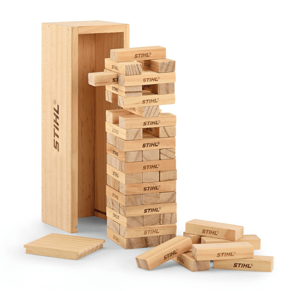 Pevné nervy a pevná ruka! To je to, co potřebujete ke hře STIHL edice této klasické skládací hry. Stohovací věž, neboli jenga,, vyrobená z borovice s certifikátem FSC, vyžaduje jistou ruku a jistě se osvědčí jako oblíbená dovednostní hra pro malé i velké. Všech 54 bloků a úložný box jsou opatřeny laserem vyrytým logem STIHL.