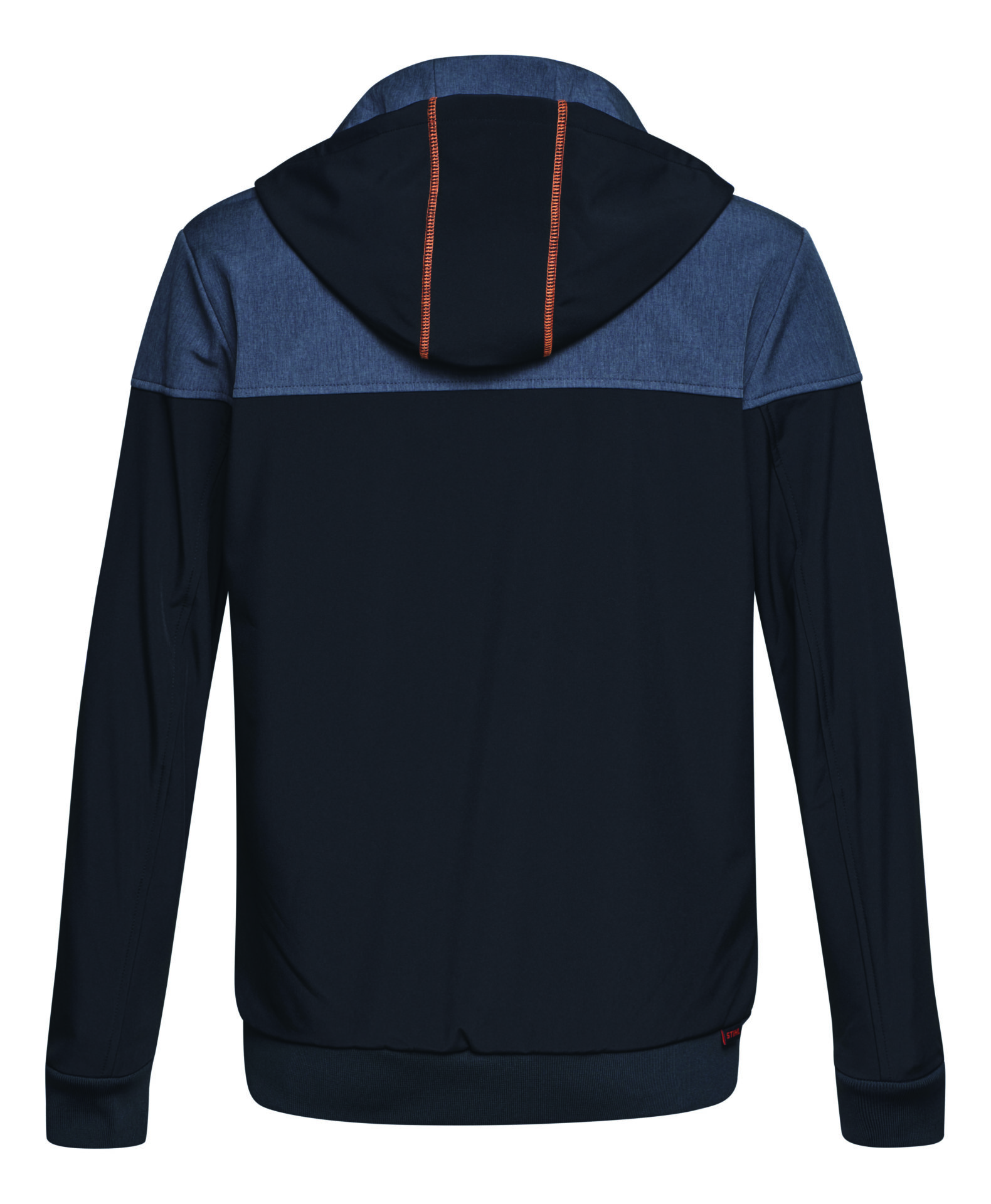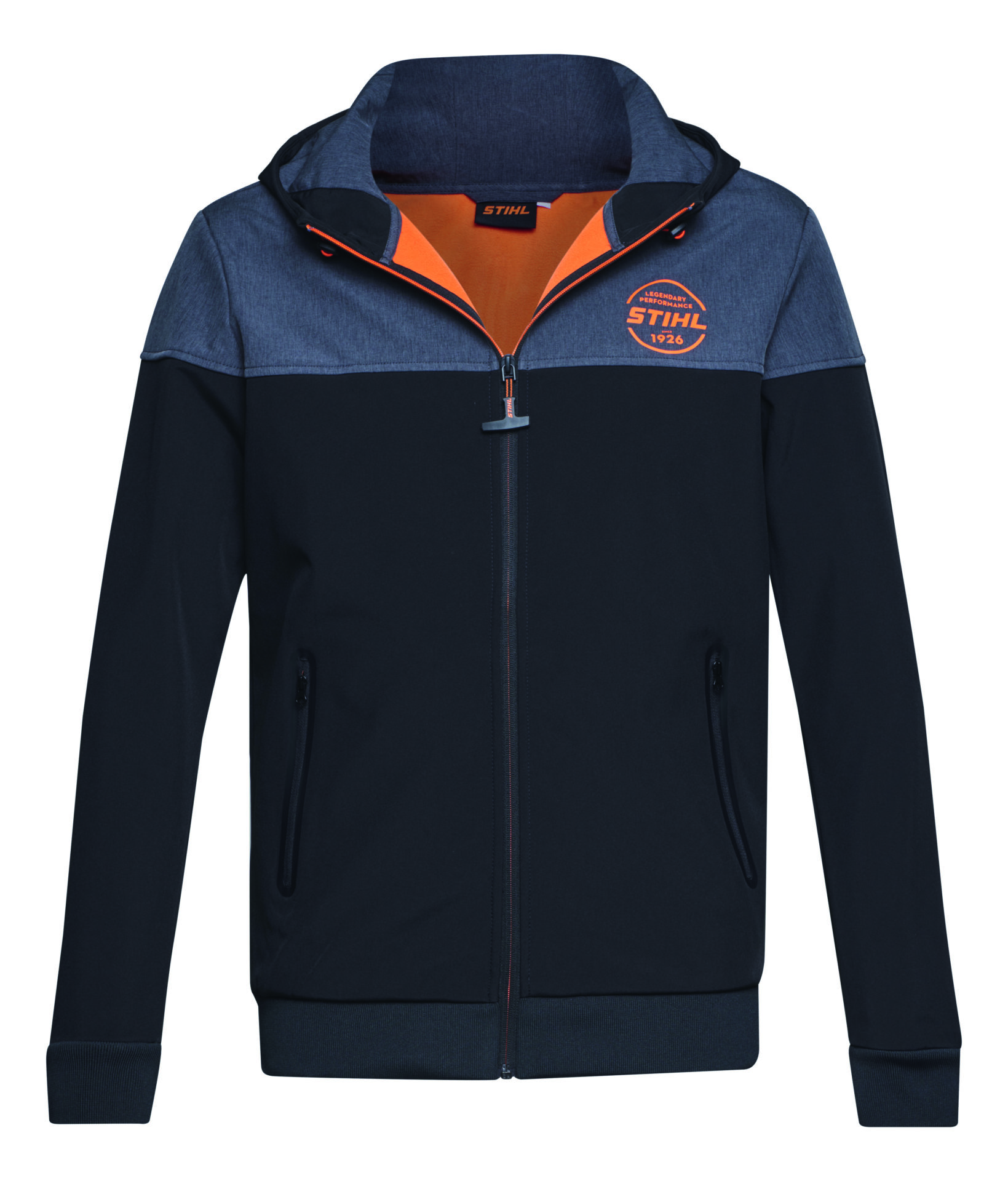 Design doplňují šedé panely na ramenou a oranžové akcenty na kapuci, kapsách i zipu STIHL ElastoStart, které dodávají bundě moderní a sportovní vzhled.