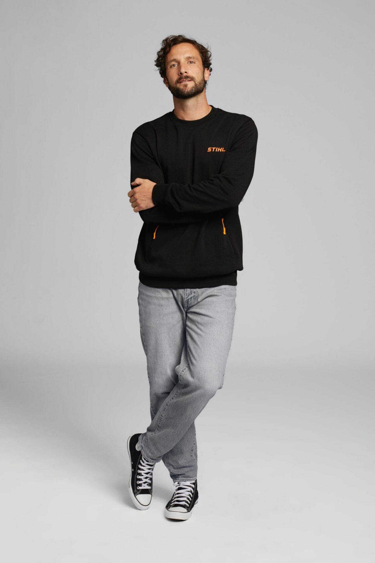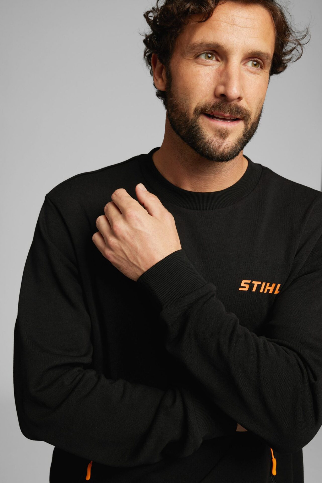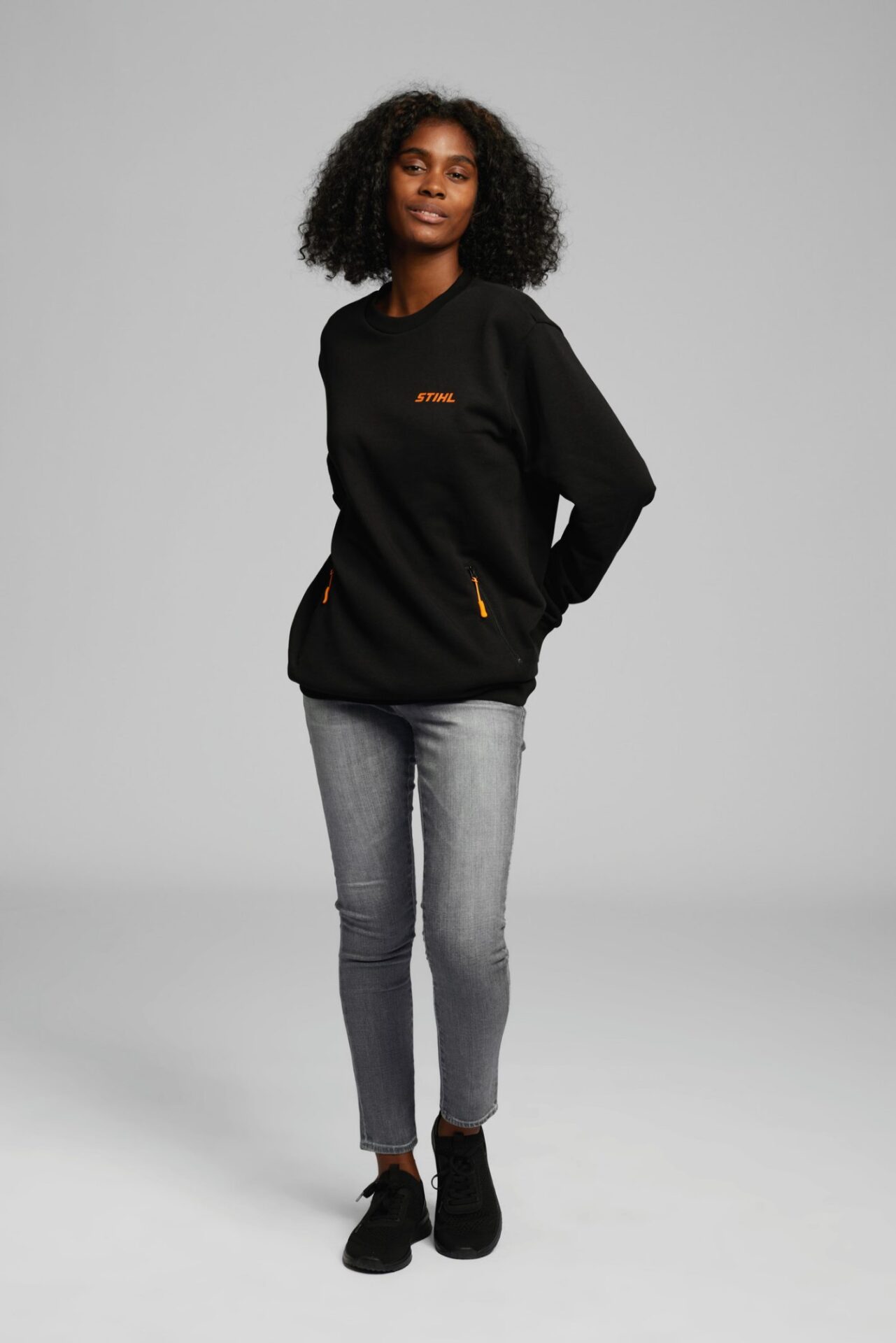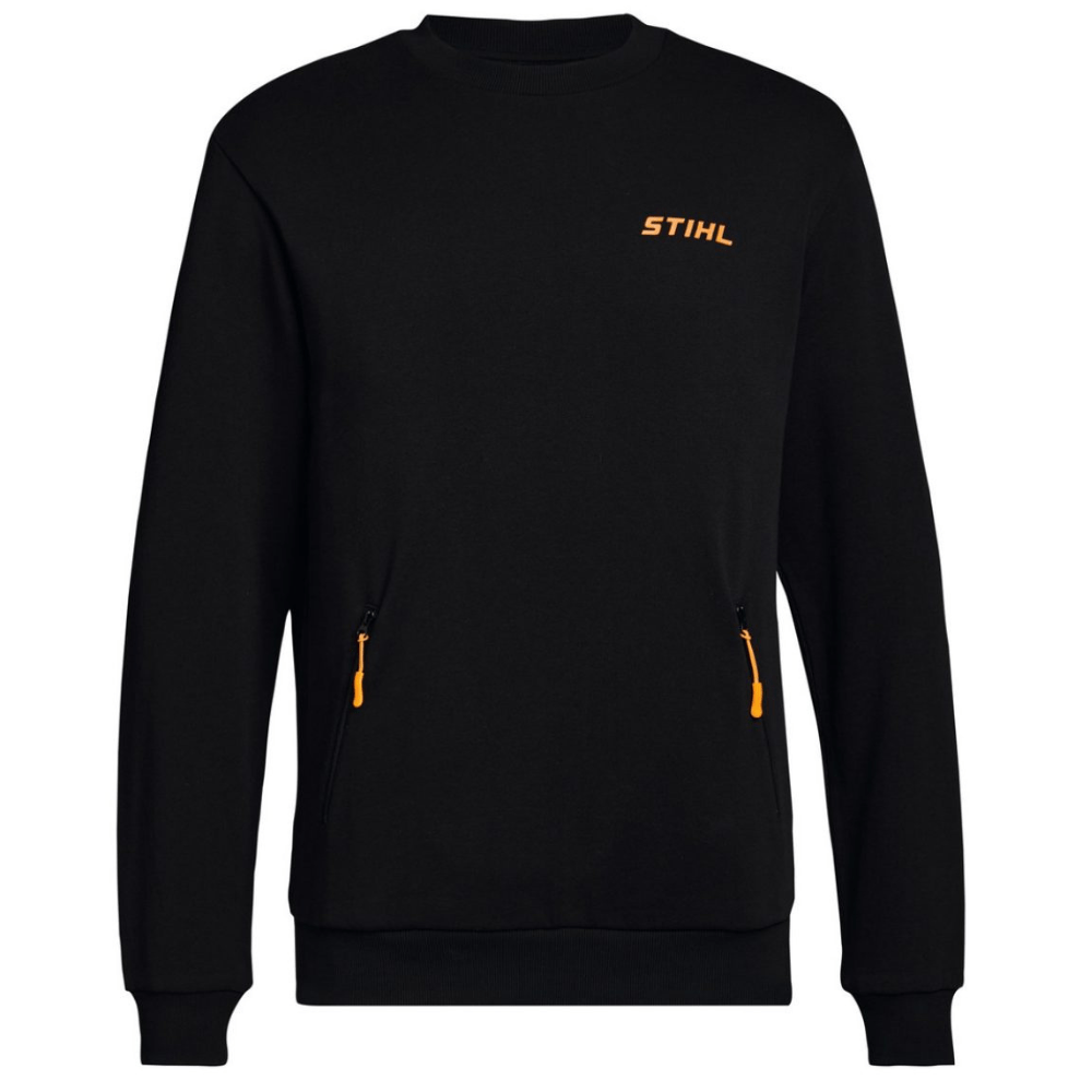 Jednoduchá mikina STIHL v černé barvě. Dvě kapsy se zipem ve výšce pasu a stahovací šňůrkou v oranžové barvě. Hruď zdobí vyvýšený 3D potisk loga STIHL.