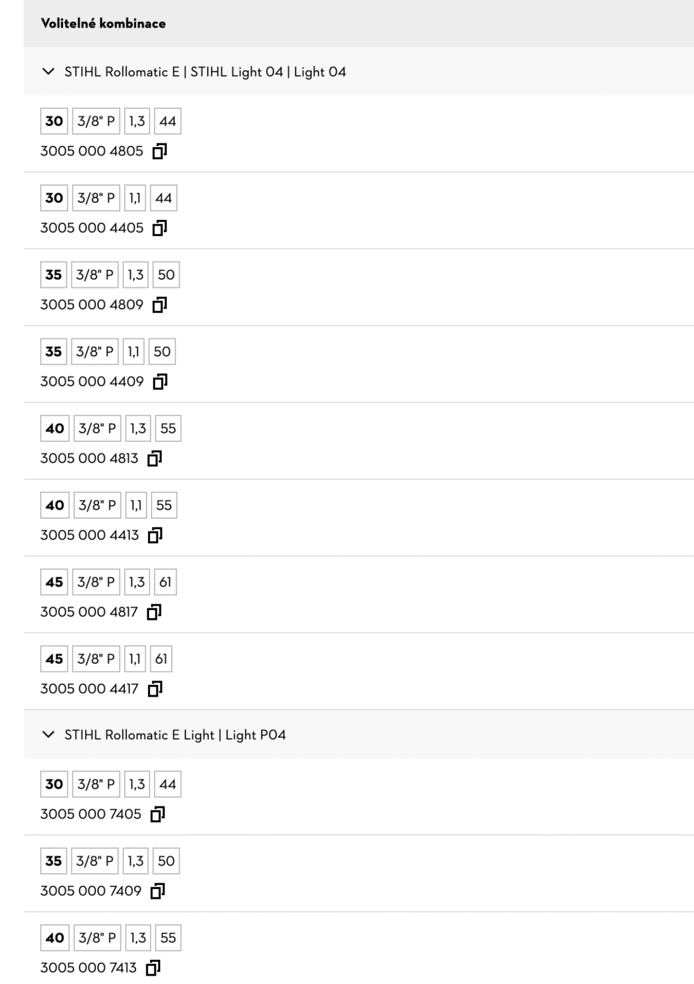 Seznam kompatibilních vodících lišt a parametrů pro výběr řetězu
