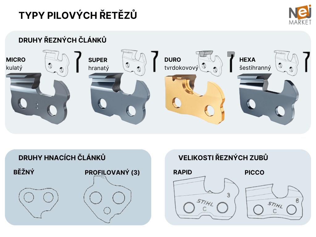 Určuje velikost článků a ovlivňují pevnost, odolnost a rychlost řezu i vhodnost pro různé pily