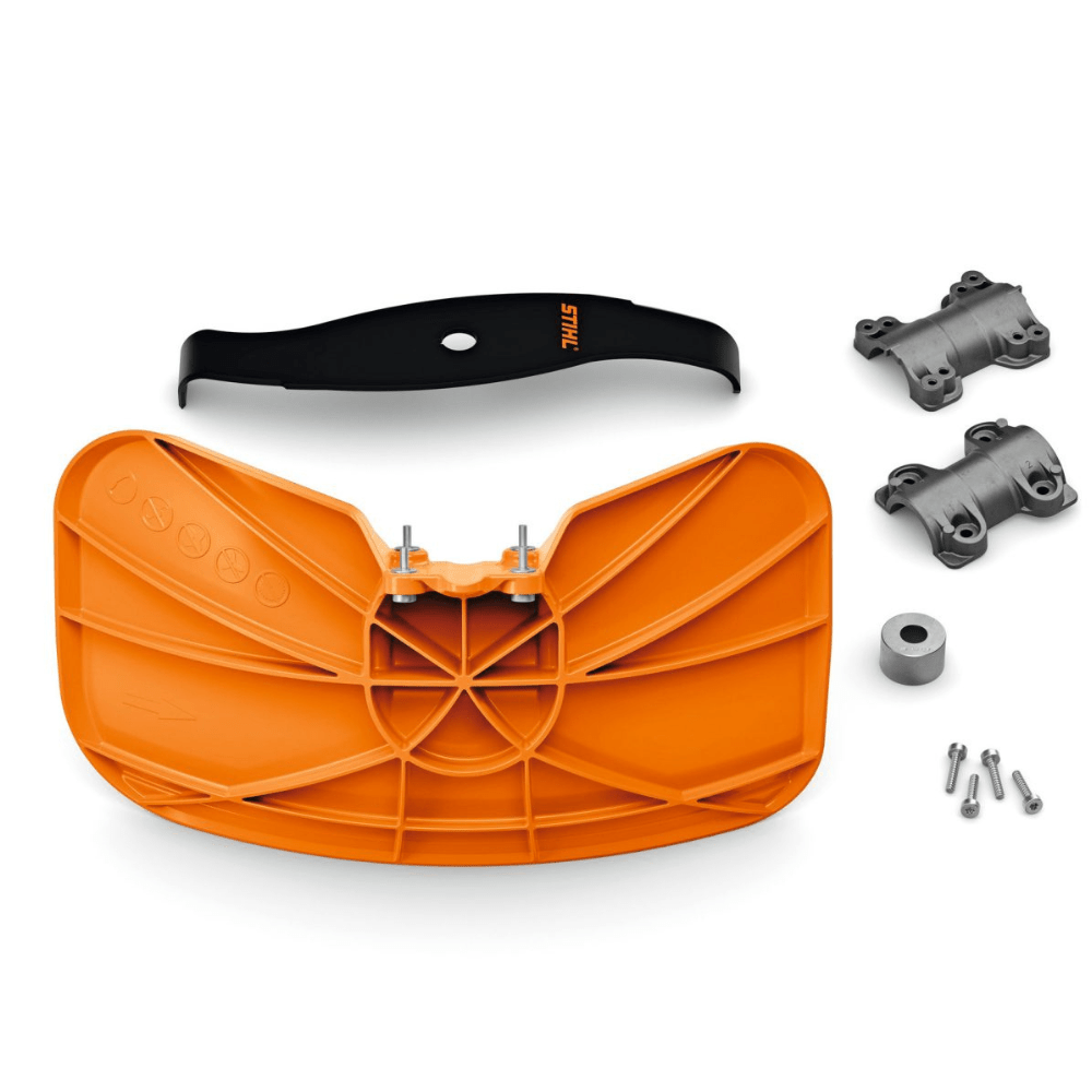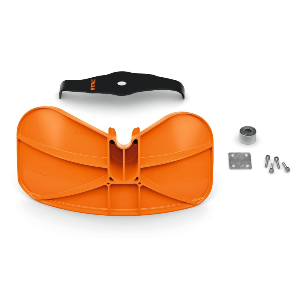 S touto štěpkovací sadou STIHL mohou profesionálové používat své křovinořezy STIHL k drcení a zároveň se těšit z lepší ochrany před odletujícím drceným materiálem. Sada nástavců pro štěpkování obsahuje vše, co potřebujete k instalaci: štěpkovací nůž, ochranný kryt a potřebné montážní díly. Jednotlivé díly můžete namontovat přímo na křovinořez STIHL a poté s ním efektivně a bezpečně odstraňovat plevel nebo křoviny na velkých plochách. V závislosti na vegetaci se při štěpkování vedle posekané trávy míchají i nečistoty a drobné kameny, před kterými vás ochrání kryt štěpkovacího nože. Přesto byste měli být při práci vybaveni vhodnými ochrannými pomůckami STIHL.