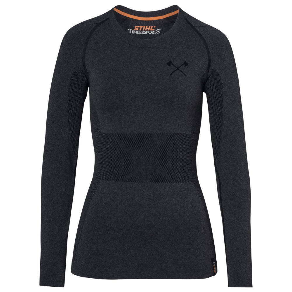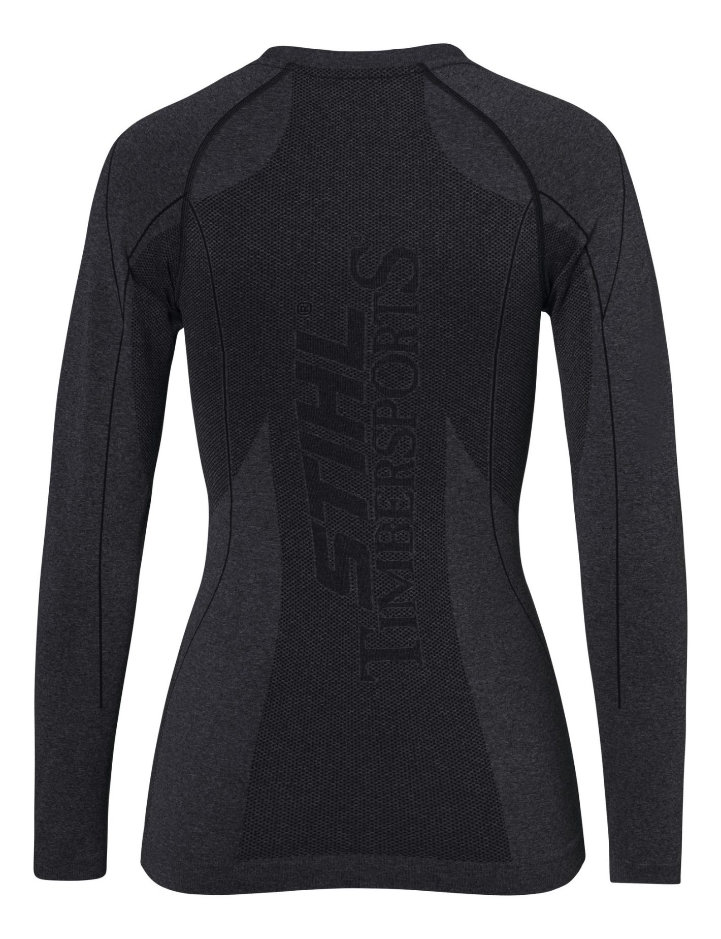 Barva šedá, 52% polyamid 42% polyester, 6% elastan, hladce pletená, přiléhavá košile s dlouhým rukávem, pletené logo „STIHL TIMBERSPORTS®“ na zádech a pletené v osách nad hrudníkem, na štítku poutko „STIHL“ lem, páska na krk v oranžové barvě.