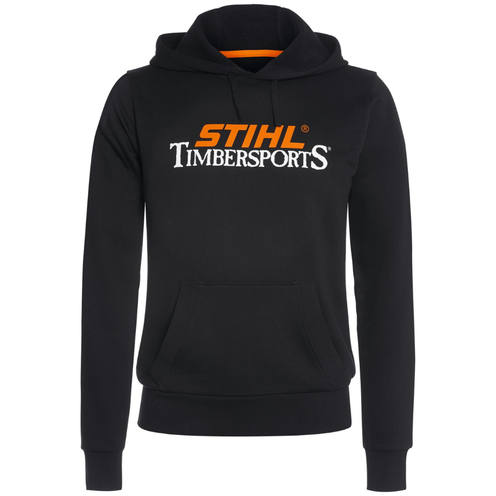 Černá je krásná: černá mikina s kapucí toto heslo splňuje. S výjimkou oranžového pásku u krku a výrazného loga „STIHL TIMBERSPORTS®“ na hrudi je čistě bavlněná mikina kompletně v nadčasové módní barvě.
