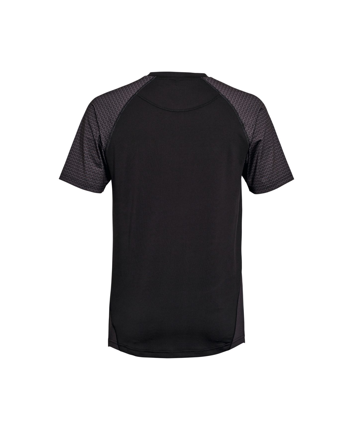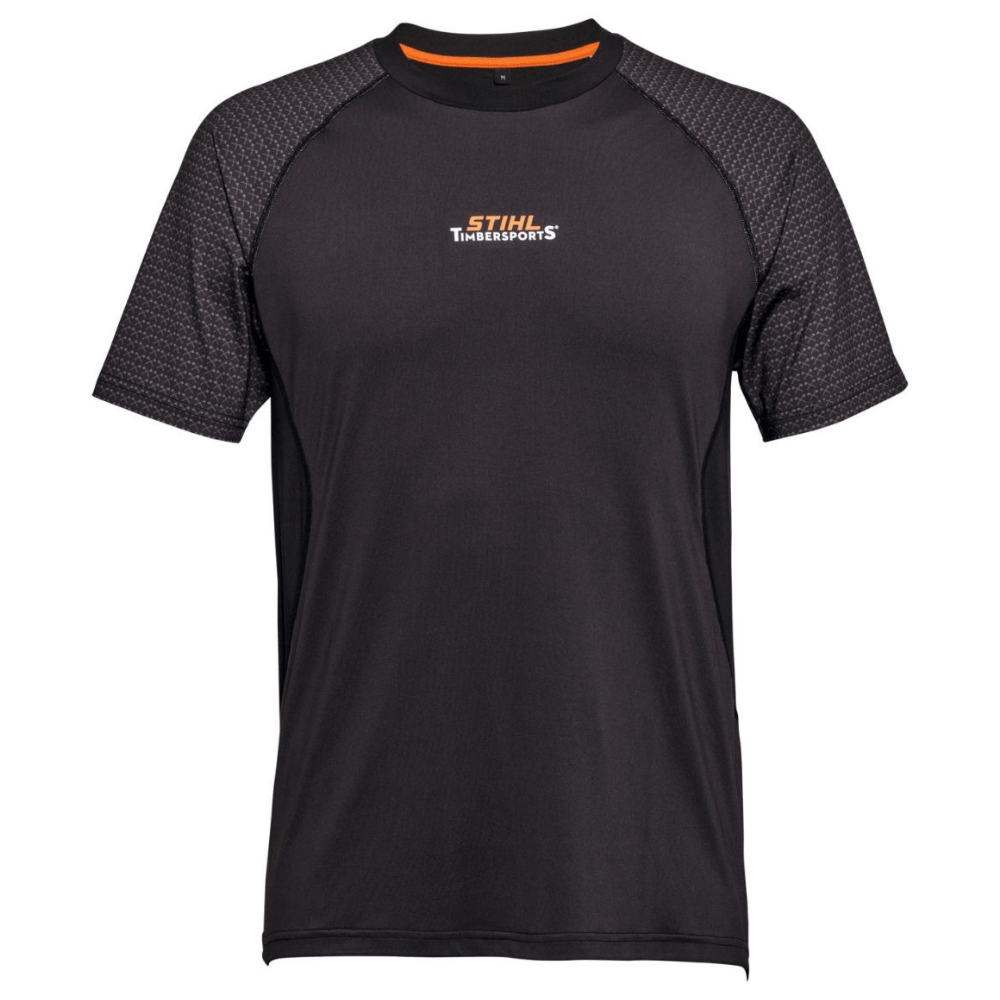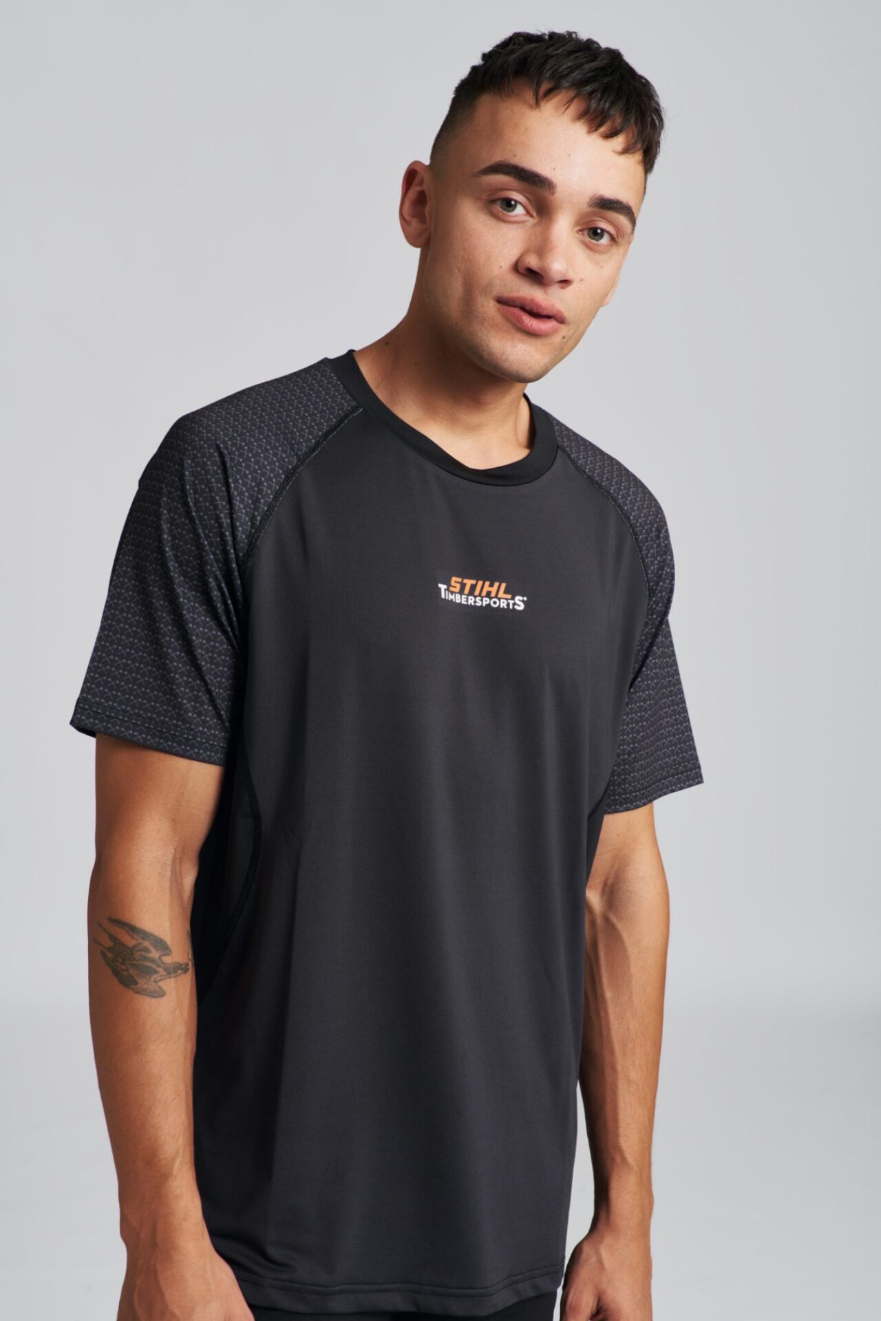 Funkční tričko v černé a tmavě šedé barvě s logem TIMBERSPORTS® na hrudi v originálních barvách. Rukávy zdobí malé tištěné sekery.