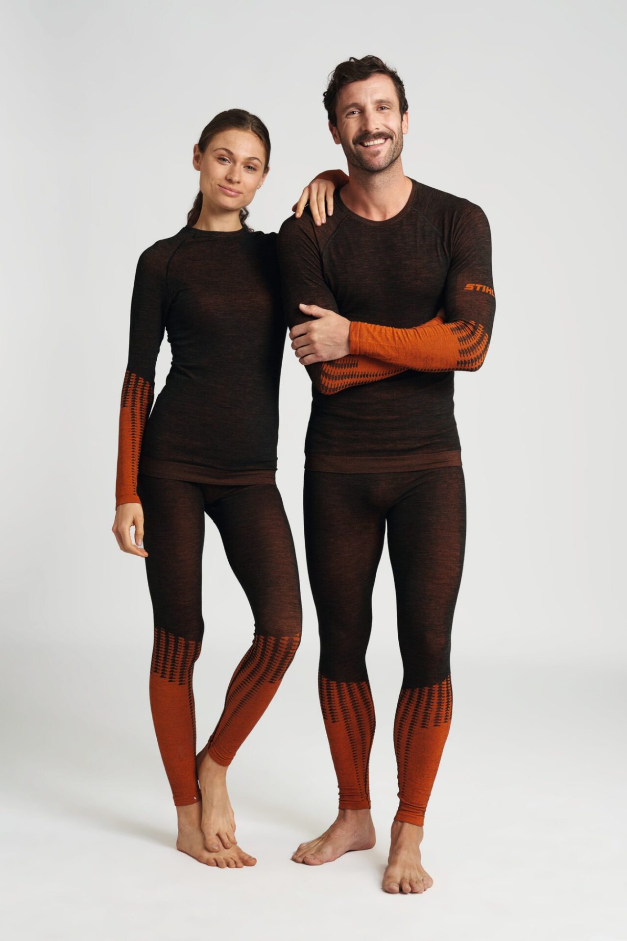 Dlouhé spodní prádlo STIHL pro sport a volný čas ze směsi lyocellu a merina. Kalhoty jsou v tmavě šedé melanžové barvě s pleteným vzorem malých řetězových pil v oranžové barvě. V pase je zdůrazněné pletené logo STIHL a řetězová pila.
